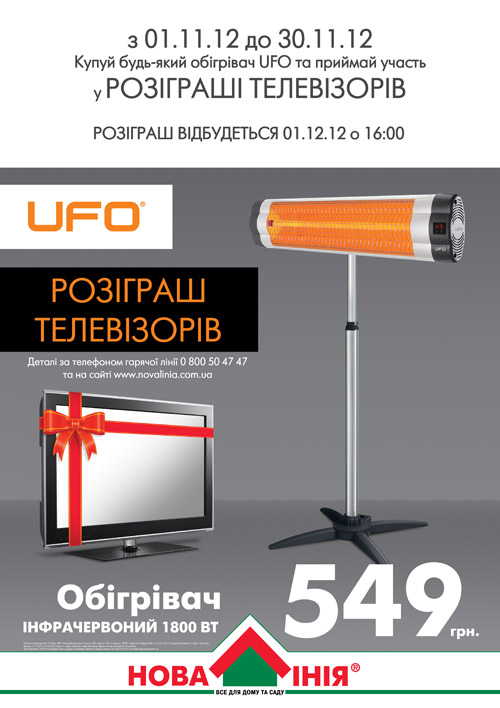 Инфракрасные обогреватели – маленький домашний заменитель солнца, которого так не хватает в эту холодную, осеннюю пору! Они не нагревают воздух, который прозрачен для инфракрасных волн, но нагревают предметы, находящиеся в зоне облучения, которые затем отдают тепло в атмосферу помещения, тем самым создавая комфортные для человека температурные условия. "Новая Линия" совместно с ТМ "UFO" объявляет о старте беспрецедентной акции! Все посетители наших гипермаркетов "Новая Линия" по всей Украине, которые приобретут с 1.11 по 30.11 инфракрасный обогреватель от ТМ "UFO" гарантированно становятся участниками розыгрыша ценных призов - широкоформатных LSD-телевизоров! Период действия акции: с 1.11.12 по 30.11.12 Новая Линия - все для дома и сада!